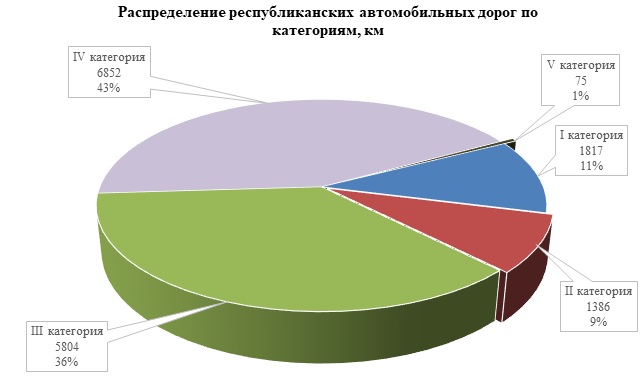 В зависимости от эксплуатационных характеристик, геометрических параметров и условий дорожного движения автомобильные дороги классифицируют по категориям. Республиканские автомобильные дороги разделены на категории следующим образом: