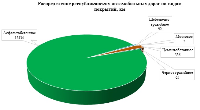 Все 15 934 км республиканских автомобильных дорог имеют твердое покрытие, в том числе: